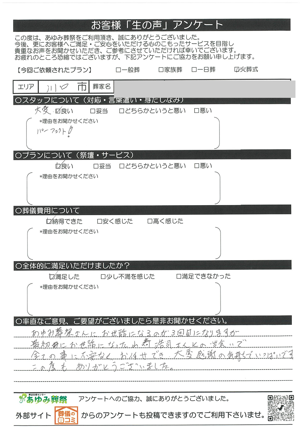このたびは当社をご利用いただき、また温かいご感想をお寄せくださりありがとうございます。 ご家族の想いに寄り添えるよう、これからも誠実に努めてまいります。