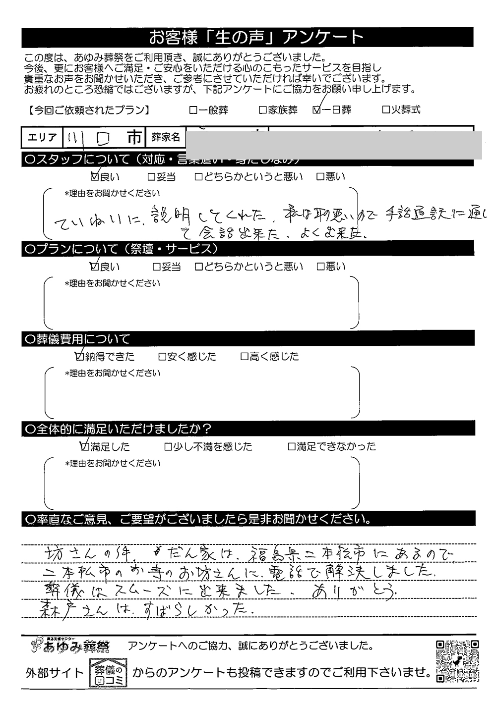 このたびは大切なお声をお寄せいただき、誠にありがとうございます。今後もご安心いただけるご葬儀を心がけてまいります。